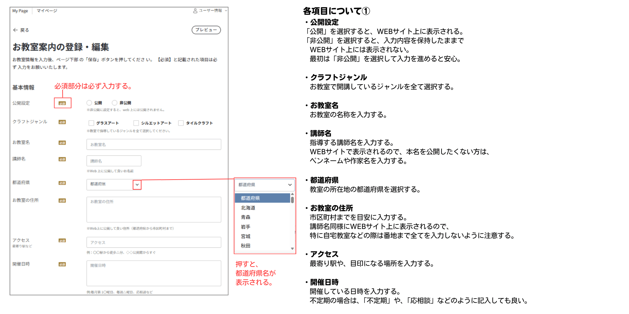 ・「必須」と記載された項目は必ず入力をする。